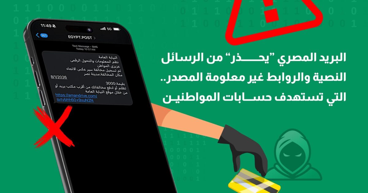 ويوضح البريد المصري أن جميع هذه الرسائل غير صادرة عنه، محذرًا جميع المواطنين من حملات التصيد الاحتيالي الجديدة عبر الرسائل النصية المزيفة، ويدعو البريد المصري جميع المواطنين إلى اليقظة والحذر، وعدم التفاعل مع مثل هذه الرسائل، حفاظًا على سلامة حساباتهم المالية والشخصية؛ ويؤكد البريد المصري أن الرسائل الصادرة بشأن المخالفات المرورية تتضمن فقط رابط موقع النيابة العامة الرسمي وهو https://ppo.gov.eg/tr ولا يتم إدراج أي روابط أخرى بخلاف هذا الرابط الرسمي.