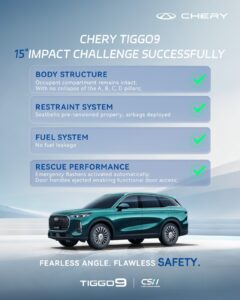 ومن الملاحظ أنه بعد اجتياز اختبار الاصطدام بانحراف 15 درجة، احتفظت TIGGO9 بقدرة فتح الأبواب الأربع، كما فعّلت الأنظمة الذكية التحذيرات الضوئية تلقائيًا، فيما ظلت الأنظمة الكهربائية عالية الجهد ونظام الوقود في حالة آمنة بعد الحادث – وهي تفاصيل حاسمة في تسهيل خروج الركاب وتسريع عمليات الإنقاذ.